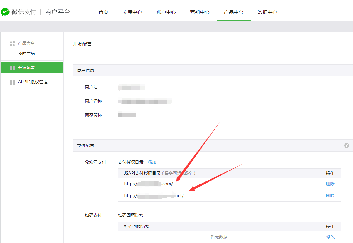正文开始 https://www.cnblogs.com/isdong/p/16449443.html 微信公众号H5调起支付时,点击支付按钮出现“当前页面的URL未注册”的提示。 这是因为:由于2017年8月1日微信官方把关于支付的信息转移到了商户平台:公众平台微信支付公众号支付授权目录、扫码支付回调URL配置入口已于8月1日迁移至商户平台(pay.weixin.qq.com ) 所以进入以下位置: 登录微信商户平台-产品中心-开发配置,配置支付授权路径。如果掉起支付的页面在 域名/pay.html中,那么就在此添加授权路径,如我的掉起支付的页面在www.weixinPay.com/pay.html 中,那么授权目录就配置为http://www.weixinPay.com/ 注意:后面的 / 一定要加上,表示该路径下的页面都可以调起微信的支付接口。
